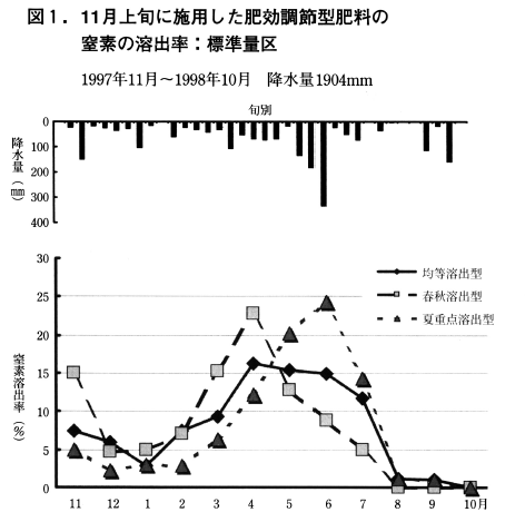 このように,肥効調節型肥料は,継続的に窒素を供給することができることから,果樹栽培においても環境負荷低減,省力化等の観点から有効であると考えられる。なお,肥効調節型肥料は地温により窒素の溶出速度が強く影響されるので,11月上旬施用の時期を厳守し,施肥時期を逸した場合は,肥効調節型肥料ではなく有機配合肥料を施用する。また,肥効調節型肥料施用の場合は,土壌条件は問わないが,土壌が過乾のときは窒素の溶出やその根群域への浸透が遅れるおそれがあるので注意する。