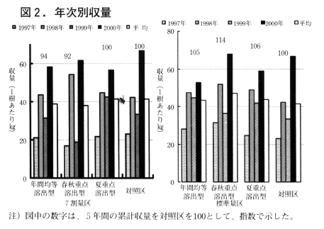 一方,春秋重点溶出型では窒素の溶出のピークが4月と早いので,7割量区は夏季に窒素不足となり,隔年結果が大きく低収量となるが,標準量区は窒素溶出量が7割量区より多いので窒素不足とならず,また,7月の葉中窒素濃度の高いことが累計収量が多い一因と推測される。このため,春秋重点溶出型では窒素施用の削減率を30%より少なくする必要がある。