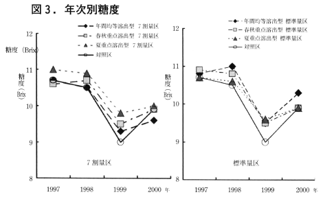 2)果実の糖度は,夏重点溶出型の肥効調節型肥料7割量を施用した区は有機配合肥料の対照区より高かった。