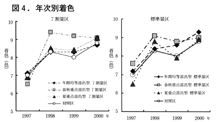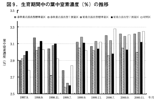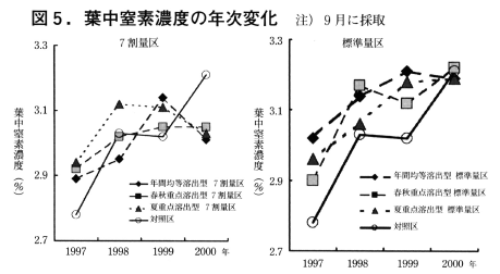 葉中窒素濃度(9月)は,有機配合肥料の対照区で年次変化が大きく,1997年,1998年,1999年では夏重点溶出型の肥効調節型肥料7割量を施用した区が有機配合肥料の対照区より高かった。肥効調節型肥料・標準量区では,全般的に葉中窒素濃度が対照区に比べ高かった。