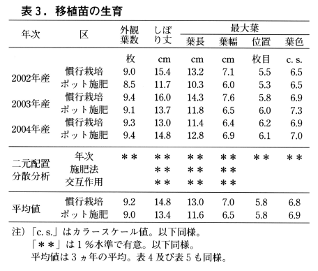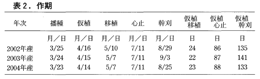 また,潅水は10時と14時の1日2回ホースにて散水し,追肥は両区とも尿素人り複合スイヒゲン(17-13-16)400倍希釈液を坪当たり8ℓで3回処理した。作期は表2に示す。畦間120cm,株間33cmで移植した。調査は,生育(移植時,移植後30日,開花期)及び収量とし,2反復とした(ただし,2002年の収量は反復無し)。肥料の窒素溶出率は,新潟県農業総合研究所の簡易推定法により2003年と2004年に調査した。