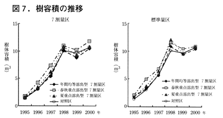 7割量区の樹の生育では,主幹周,樹容積ともに春秋重点溶出型が大きかった。しかし,春秋重点溶出型の1995年での樹容積,主幹周が他の区よりわずかに大きいものの,2000年/1995年の比では樹容積は対照区でやや大で,主幹周は処理による差はほとんど認められなかった。標準量区の主幹周,樹容積もほぼ同様の結果であった。