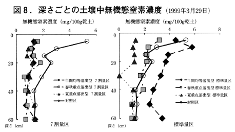 1998年6月中旬から1999年8月上旬における深さ10cmの表土中無機態窒素濃度の推移では,1999年の5月下旬は4月,5月前半の少雨のため対照区が高かったが,ほかの時期は夏重点7割量区と対照区がほぼ同程度で推移した(データ略)。