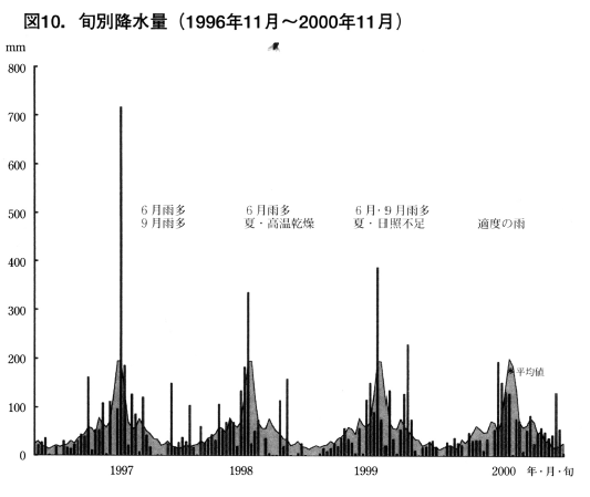 また,この試験期間においても,年による降水量の変動がかなりあるので,気象変動にも耐えうる肥効調節型肥料の配合内容となるよう,重ねて検討する。