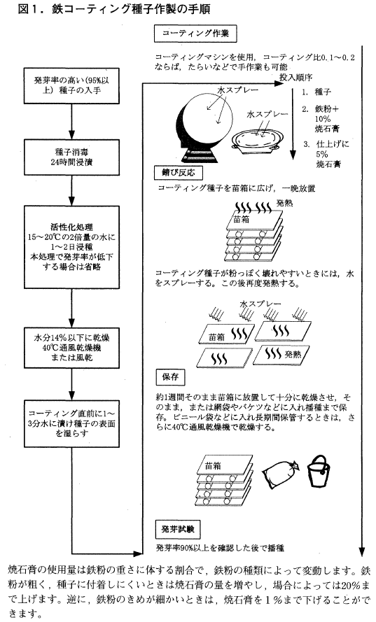 鉄コーティング湛水直播技術にはさまざまなメリットがあります。一方で、種子を鉄粉でコーテイングする原理は酸化(錆)反応であり,発熱と酸素の吸収を伴い,注意も必要です。そこで,鉄コーティング湛水直播のやり方と注意点を述べます。