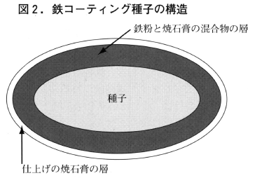1)鉄コーティング比(種子の重さに対して使用する鉄粉の重さの比率)をきめます。初めて行うときは鉄コーティング比を0.5とし,その時の浮き苗やスズメの食害の発生程度を見て,次回はコーテイング比を1から0.1の間で上下させます。鉄コーティング種子は鉄と焼石膏の2層からなっています(図2)。焼石膏は錆反応を促進するために使っていますが,水と反応して固まる性質も持っています。また,種子の発芽や初期生長に影響を与えないので,鉄粉のきめが粗いときは増量するなど,分量を適宜調節できます。