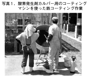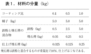 4)活性化種子を1~3分水に浸けることにより種子の表面のみを湿らせた後,コーティングマシンに入れます(図1)。次に鉄粉と焼石膏の混合物を少量入れ,水をスプレーしながら造粒します(写真1)。コーティング比が小さいときは,たらいなどを使い手作業でコーティングすることもできます。