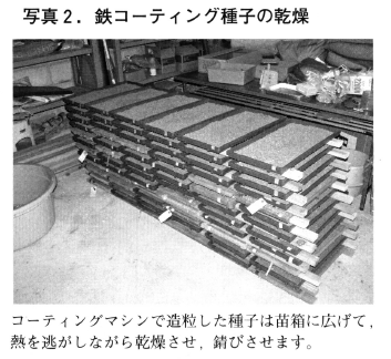6)苗箱などの底の浅い箱に入れ,錆を進めると同時に乾燥させます(写真2)。コーティング直後では鉄は酸化されていないので灰色ですが,この後発熱し酸素を吸収し,茶色の錆びた色になります。そのため,コーテイングした種子は塊にせず,薄く広げて熱を逃がします。目安は苗箱あたり,コーティング種子1kg程度です。また風通しの良い所で作業します。種子が乾くと酸化は停止します。錆びの発生程度は気温,湿度,苗箱に入れる種子の量などによって影響を受けます。