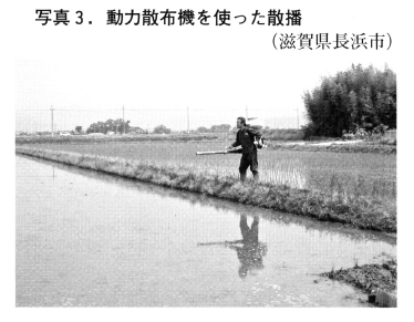 鉄コーティング種子は土壌表面に播種します(図3)。本代かきは播種の1~5日前に行い,土壌が落ち着いて,鉄コーティング種子が土壌の表面にまけるようになるまで待ちます。表面播種とは播いた種子の半数ほどが地表面に見えている状況です。代かき水の中に動力散布機を使って散播します(写真3)。