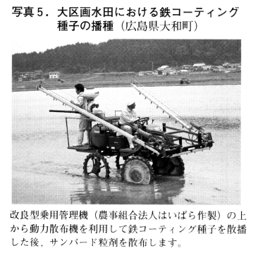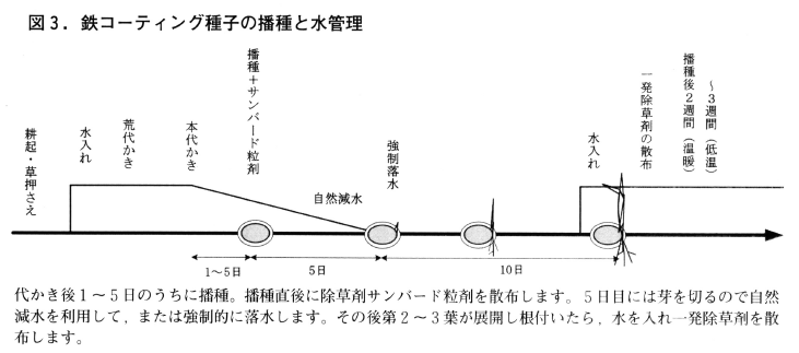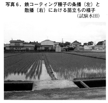 以上は鉄コーティング湛水直播の基本形ですが,さまざまな便宜的な方法もあります。カモが飛来する水田,条播のために落水した水田,土壌の還元が進みやすい水田では落水した後で表面播種し,苗立ちが完了した後水を入れて,湛水直播用の除草剤を散布することもできます。また,活性化種子を使用していますが,出芽は催芽種子に比べて遅い傾向があります。便宜的に催芽種子を鉄コーティングして播種できます。この場合,コーテイングした後2~3日のうちに播種しますので,種子は十分に乾いていません。そこで,コーティング後は苗箱に入れたままにしておき,播種直前に取り出し発熱による種子の損傷を回避するなどの工夫が必要です。