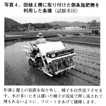 条播する時は,湛水直播専用機や田植え機に装着できる側条施肥機を利用した直播装置から作溝と覆土の装置を取り外し,種子が土壌表面に自然落下できるようにします(写真4)。