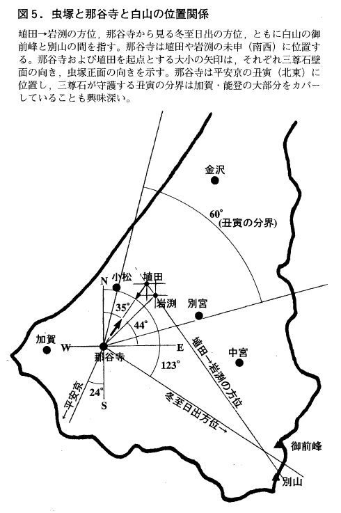 小松市那谷町にある高野山真言宗別格本山「那谷寺」から眺める冬至日出は,白山の御前峰と別山の間から現われる(図5)。生産霊の日向信仰,辰巳信仰に基づいた位置設定である。これだけでも「那谷寺」は重要な意味を持つが,その位置はまた,二つの虫塚からは南西(未申)にあたる(図5)。