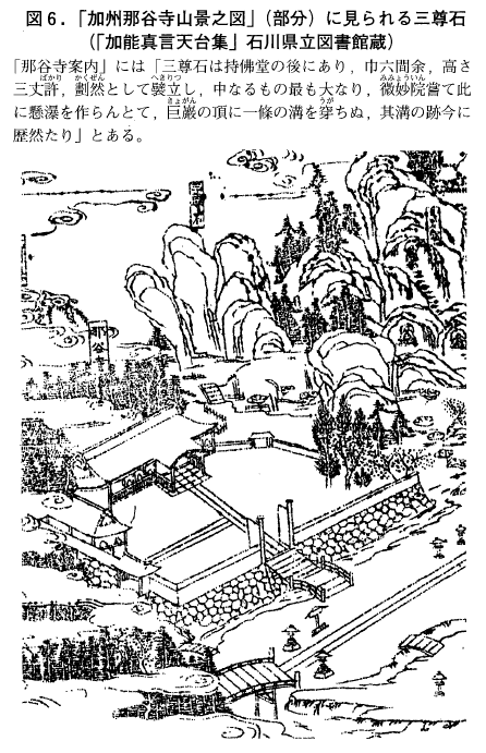 しかし十一面千手観音を本尊とする那谷寺の三尊石は観音菩薩を脇侍とする「阿弥陀三尊」がふさわしい。寛永十七年(1640年)からの那谷寺再建にあたって利常は「不動院」という別院(現在の書院・庫裏にあたる)も造立し,寶永(1704~1710年)の頃までは「那谷不動院」と祈祷の守札にも書かれていたが,のちに「那谷寺」の本号に復古せられた63)。「那谷寺案内」71)には「微妙院(利常)嘗て此(三尊石)に懸瀑を作らんとて,巨巖の頂に一候の溝を穿ちぬ」とあり,三尊石の案内書きには「三尊石より滝を落とした庭園が寛永時代(1640年)に作庭されていたが,往時に荒廃してしまった」とされている。作庭記を学んだ利常が「不動院」の造立にあたって三尊石に滝を流して「不動三尊」とし,後に「那谷寺」本号の復古にあたり,滝を止め「阿弥陀三尊」に復したものと考える。