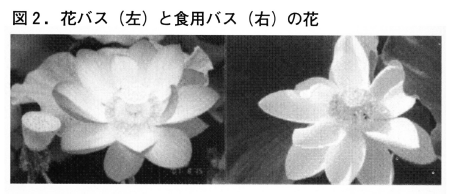 東洋産ハスの花の色といえば,花バス,食用バスとも,桃色あるいは紅色をイメージするが,土浦市で見られる最近の食用バスは、図2右のような白色が主体である。土浦地域農業改良普及センターの栽培マニュアルによれば,栽培48種のうち44種が白であり,中でも栽の64%を占める中晩生種はほぼ100%が白色である。