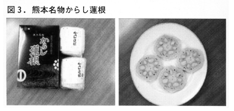 熊本名物「からし蓮根」は藤田千恵子(2004)氏によれば江戸末期に,肥後藩の当主細川忠利公の病弱な体を心配した玄宅和尚が,お城の濠に自生する薬効高い蓮根に目をつけ常食を進言したが「どぶの中のものなど」と却下されたという。そこで,城内で料理のアイデアを募ったところ,賄い方の1人,森平五郎が蓮根の穴に味噌と辛子を詰め,衣を付けて揚げた「からし蓮根」を提言した。細川公はこの「からし蓮根」が大層美味であり,また蓮根の切り口(図3参照)が,細川家の家紋”九曜”に似ていてめでたいと喜んで召し上がり,健康になられたとの事である。森平五郎の開発した「森からし蓮根」は,現在18代目の森久裕氏に受け継がれ,熊本市内に立派な暖簾を掲げて早朝から営業している。四国産の和からしと地元産の味噌に,クチナシの実で黄色い衣の色づけをし,見事なハーモニーをかもし出し,ピリッとした辛味としゃきっとした歯ざわりは食欲増進間違いなしである。残暑厳しき土肥福岡大会(2004)の合間に訪れた熊本レンコンの旅,は名物「馬刺し」と「からし蓮根」で大いに元気づけられた。