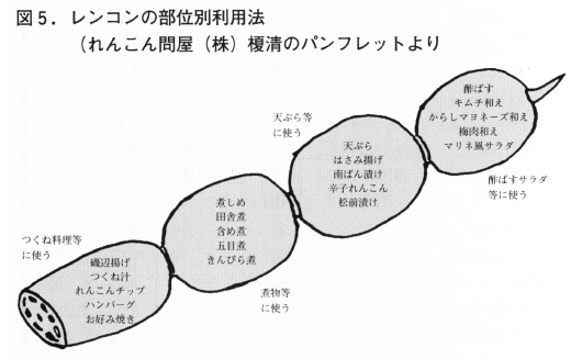 レンコン料理についてはれんこん問屋「榎清」が「レンコン料理いろいろ」の小冊子を作っており,またホームページ(http://www.enosei.co.jp/)で料理法,レンコン知識,栄養分などを紹介している。