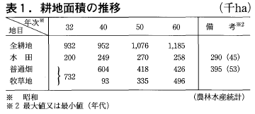 この中で水田は32年の20万haから45年に29万haとなったが,これがピークで減反政策もあって60年では26万haに漸減した。普通畑は32年の60万haから60年には43万haと激減した。一方,牧草地は急増し36年の6.7万haから41年には10万haを超え,60年には50万haとなった。この増加分は普通畑の減少と新規開発地にほぼ見合っている。