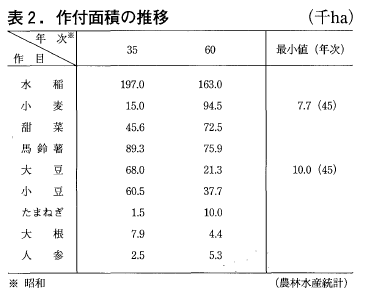 作目も大きく変った(表2)。水稲は休耕もあったが,大豆・甜菜などの畑作物や牧草,更にはタマネギなどの野菜への転換が目立つ。畑作物では小麦が一時期3万ha台になったが10万haに回復した。甜菜は漸増し,一方で燕麦などの雑穀や亜麻が激減した。野菜ではタマネギの1.5千haから1万haとなり,にんじん・はくさいが増え,大根・キャベツが減少した。