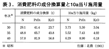 表3は昭和30~40年の動向である。成分としては三要素共ほぼ倍増しており,特に加里の増加が目立つ。消費量の増加は耕地面積の拡大や作目の変化にもよるが,10a当りの施用量も窒素が3.7kgから6.3kgに,燐酸が5.3kgから8.9kg,加里は3.0kgから6.2kgとなった。要素間の比率を見ると,窒素に対し燐酸は140程度であるが加里は81から100となっている。加里については開墾後の年数による土壌からの供給量の低下と推定されている。