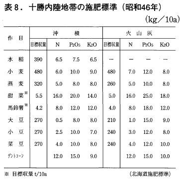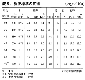 北海道農政部は昭和32年(1957)に施肥標準を設定し,以降36,42,46,53,58,平成元,7,14の各年に改訂版を出している。これは地域区分の変更,作目・品種の変遷、技術の進展などによるが,具体的には前述した収量水準の向上に伴なう施肥量の増加に合せたものである。更に一般的には標準を上まわる施肥の実態に合せた面も否めない。