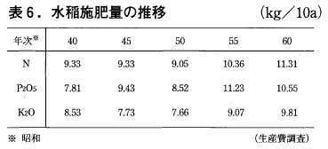 これに伴い施肥量も増加した。農水省の米生産費調査によれば表6に示す様に窒素でみると40年9.33kg/10a,60年には10.9kg/10aに達した。これは全国平均とほぼ同水準である。この間の45年から減反が実施されているが,このことが施肥量に直接関係していない様である。