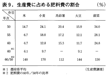 また,生産費に占める割合は,表9に示す様に50年からの10年間に,米では14.7%から6.7%に,甜菜でも34%から25%に低下している。この間,肥料費全体としては10~70%上昇している。このことは肥料費の相対的な低下が多肥の一因と考えることができよう。
