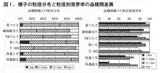 材料は,夏つかさ,耐病総太り,YRてんぐ,秋いち,T-392 ,快進2号,快調総太の7品種の種子を用いた。2002年8月14日に,各品種の種子1dlをそれぞれアルミ製縦目篩(不二金属工業製)を用いて粒径2mm未満,2mm以上2.5mm未満,2.5mm以上3mm未満,3mm以上の4階級に分類した。各階級の種子について粒径の構成比率と発芽率を調査した。