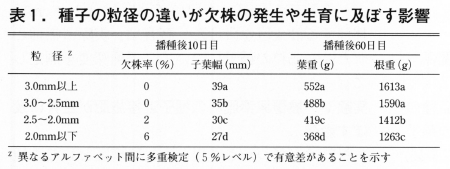 欠株率は粒径で異なり,粒径2.5mm以上では欠株はなかったが,2mm未満の種子では6%と高かった(表1)。播種後10日目の子葉幅は粒径が小さいほど小さかった。また,播種後60日目の葉重・根重も粒径が小さいほど小さかった。