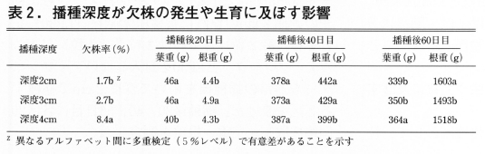 欠株の発生は,播種深度が深い区ほど多かった(表2)。特に,深度4cm区の欠株率は8%以上と顕著に高かった。葉部の生育は播種後40日目以降は処理区間で差は認められなかった。一方,播種後60日目の根部の生育は播種深度3cm以上で劣る傾向であった。