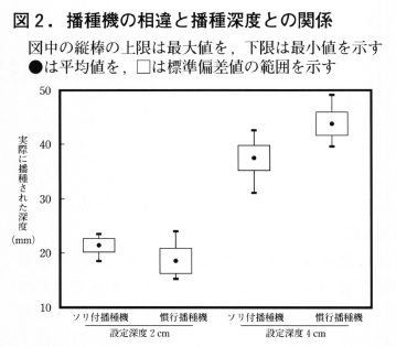 材料は,夏つかさを用いた。処理区として,通常の播種機とソリ付き播種機(日本プラントシーダー株製TSA-8ST)を用いて深度2cmと4cmで播種する計4区を設けた。調査は,実際に播種された60~65粒の種子について,播種深度を測定して行った。