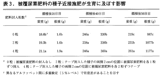 被覆尿素肥料を種子の両側2cmの位置に計4粒テープ封入することにより,生育全般にわたって葉根部の生育が促進される傾向であった(表3)。しかし,この効果は,種子の両側に被覆尿素肥料を計2粒封入した場合は明確ではなかった。