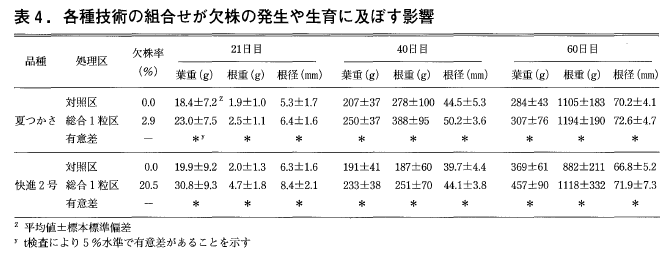 総合1粒区の欠株率は,夏つかさが2.9%であったのに対し,快進2号では20.5%と顕著に高かった(表4)。収穫期の根重は,夏つかさ,快進2号ともに総合1粒区で対照区より大きかった。一方,根重のバラツキは,夏つかさでは総合1粒区と対照区との間で大差なく,快進2号では総合1粒区が対照区に比べて極端に大きな個体や小さな個体が発生した。