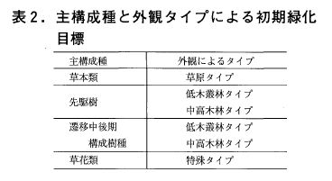 短期の緑化目標といっても,5~10年後という期間となりますが,草原タイプ,低木叢林タイプ,中高木林タイプが主な緑化目標です。もう一つ,特殊タイプがありますが,これは修景を目的とする草花類の群落などを指します。