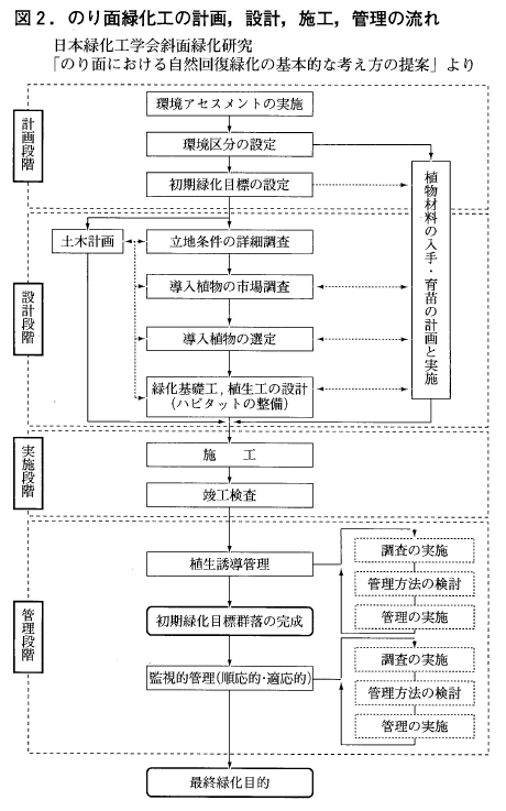 植物を用いる技術という点では共通ですが,生産・収量を重視する農業と建設・土木工事において侵食防止を主目的として実施するのり面緑化の異なる点については,前号に大雑把にしめしました。今回は,のり面緑化の基本的な流れについて述べることとし,次回以降,植物材料,工法などについて具体的に述べて行くものとします。
