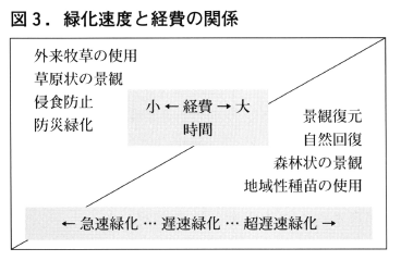 高度の緑化目標を設定するのは,数十年という時間をかけた自然回復を持つことができない場合に実施されるものと考えて良く,緑化目標をより植生遷移の後期,すなわち草本タイプ→低木叢林タイプ→中高木林タイプと高度にするにつれ,導入植物の選定と,緑化基礎工の高度な組み合わせが必要となり,施工費の増大と維持管理工の必要性が増すものとなります。