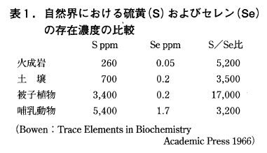 セレンは物理的,化学的性質は硫黄によく似ていますが,地球上における存在量は硫黄に比べて極めて僅かです(表1)。しかしその存在は無視できるものではなく,次に紹介するように動物にセレンの過剰や欠乏を引き起こす地域は,地球上のかなり広範囲に分布しています。