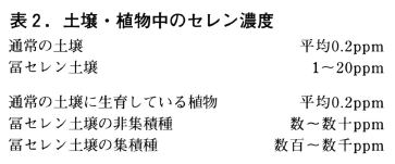 一般の土壌のセレン濃度は0.2~0.4ppm程度で非常に低いが,母材や生成条件によっては通常の数倍ないし数十倍も高い「富セレン土壌」とよばれる特殊な土壌が存在します(表2)。