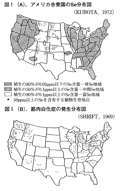 アメリカ合衆国の大西洋,太平洋沿岸地域には家畜の筋肉白化症という風土病がありました。これははじめビタミンE欠乏症と考えられていましたが,ビタミンE以外に少量のセレンの投与が有効で,牧草中のセレン含量が0.05ppm以下のとき起こりやすいことが判明しました(図1A,B)。