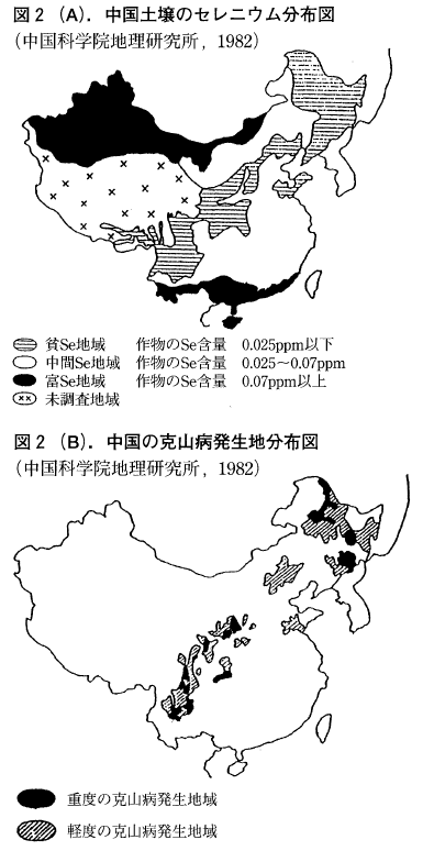 また中国の東北部から南西の雲南省に至る帯状地域に,”克山病”*2というヒトの風土病(一種の心筋症)がありましたが,当該地域の作物および患者の血液や毛髪中のセレン濃度が低いことから,セレン投与を行ったところ顕著な効果のあることが認められ,セレン欠乏に起因するものと考えられました(図2A,B)。