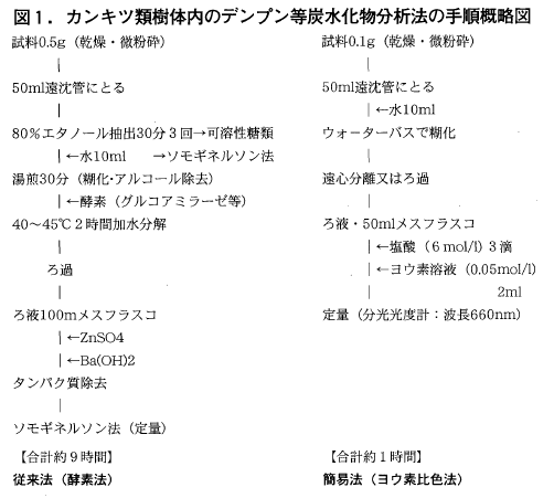 前述の1984(昭和59)年から継続された研究の中で,デンプン分析法としてグルコアミラーゼ主体の酵素法で抽出し,ソモギネルソン法で定量する方法(図1左)を用いれば,遮光・全摘果等の処理を反映する「機能性炭水化物」としてのデンプンの厳密な定量に有効であることが示された(杉山ら,1992)。