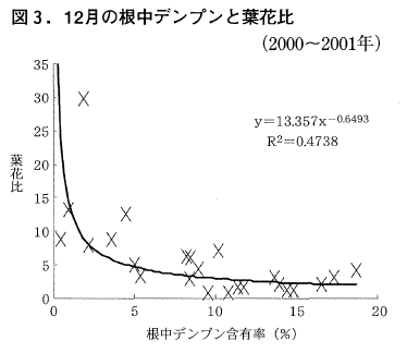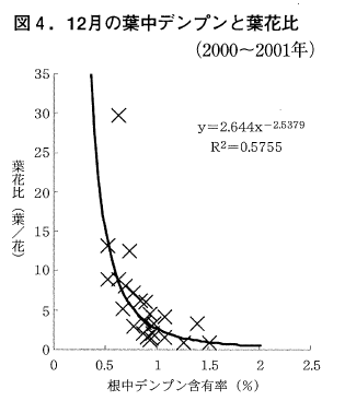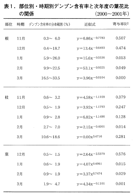 横軸にデンプン含有率縦軸に葉花比をとった図2~4がそれぞれ根・枝・葉のデンプン含有率と翌年の着花との関係を示している。同様に,上記の期間の3部位について,デンプン含有率の分布範囲,近似式と寄与率(R2)を示した(表1)。