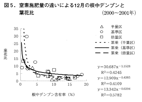 分析等の栄養診断をおこなってきた。根中デンプンの分析は平成2年産から開始され,前述のように,この診断法開発により11月下旬~12月上旬の適期採取とすばやい分析ができて,1月上旬JA技術員役員会議で発表することが可能になった。