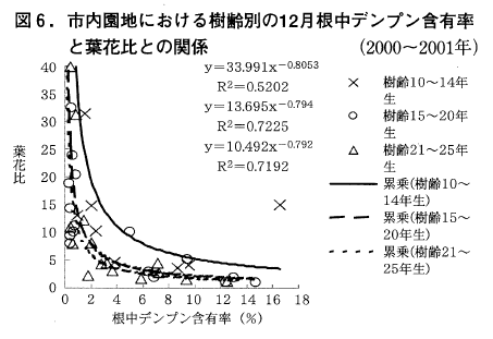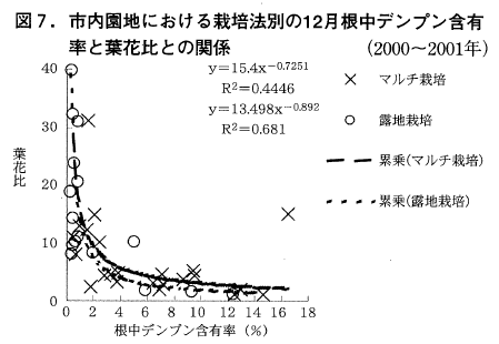 葉花比が高い(着花数が少ない)傾向を示した(図6)。これは,若木では栄養生長の方に炭水化物が分配されやすい傾向を示しており,着花数の増加に結びつかないと考えられた。また,マルチ栽培と裸地(普通)栽培とを比較すると,マルチ栽培ではデンプン含有率が概ね高くなるが,葉花比は低く(着花数は多く)はならない傾向を示すこともうかがえた(図7)。
