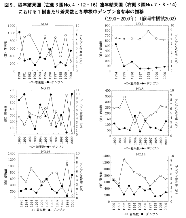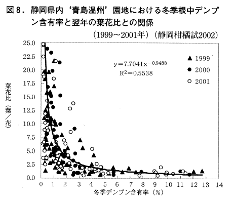 昭和59年から4年の研究期間中,静岡柑橘試では,「青島温州」1年生の苗木(杉山ら,1992)及び7年生の幼木(杉山ら,1999)を用いて,全摘果など人為的に隔年結果の状態を作り出し,冬季に樹体を解体して部分ごとに糖類とデンプン量を含有率で表し,表年の樹の根の表皮部分に多くのデンプンが蓄えられることを見出した。さらにその含有率の多少が,翌春の着花量の多少として現れるこも確かめた。