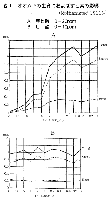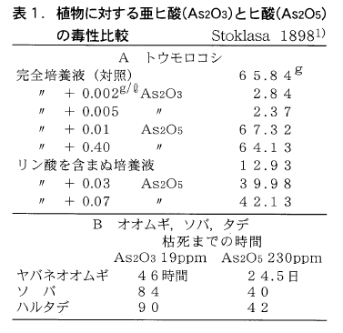 これらの初期の研究は,三価のヒ素の酸化物(亜ヒ酸)の毒性は五価のヒ素の酸化物(ヒ酸)に比べて著しく強いこと,植物の種類によってヒ素耐性に差があること,またヒ酸はリン酸の不足を部分的に補うような挙動をすることなどを示しています。