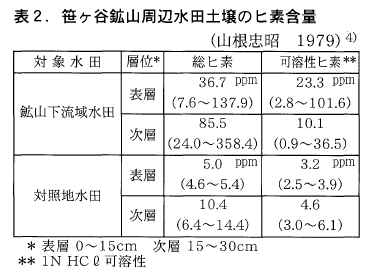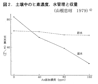 表2は笹ケ谷鉱山周辺水田土壌のヒ素濃度ですが,対照水田に比べて全ヒ素,1N-HCl可溶性ヒ素とも7倍の高さになっています。この地域のヒ素汚染水田では,苗を植え付けて活着すると灌漑を中止し,作土に割れ目が入るまで乾かし,その後はときどき田面を潤す程度の灌水をして稲作を行うのが慣行になっていました。このような節水栽培では多収は望めませんが,湛水栽培に比べるとヒ素の被害ははるかに少なくてすみました4)
