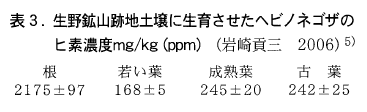 表3は兵庫県の生野鉱山跡地で採取したヘビノネゴザを跡地土壌(全ヒ素濃度651ppm)を用いてポット栽培した結果ですが,一般の陸生植物の数百倍のヒ素濃度になっています5)。因みに笹ケ谷鉱山下流域のヒ素汚染水田の水稲茎葉のヒ素濃度は,健全なものが3ppmであったのに対して,障害甚が72ppm,中が22ppm,軽が19ppmでした6)。ヘビノネゴザが高濃度のヒ素を集積しても何故生育が可能なのか,その耐性の仕組み(体内での存在形態,存在場所など)の解明が待たれます。