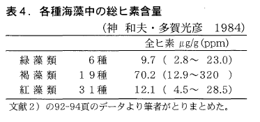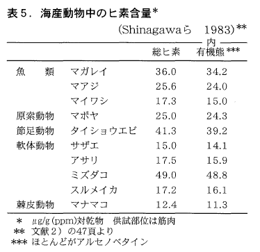 また海産の魚(マガレイ,マアジ,マイワシ)やエビ(タイショウエビ),タコ(ミズダコ)の筋肉に,数十ppmのヒ素が有機態のアルセノベタインの形で検出されています(表5)。これらの海産動物は無機態のヒ素を有機化する能力は小さいので,この結果は海水中の無機態ヒ素が海藻やプランクトン類によって有機化され,プランクトンあるいは海藻食性動物から肉食性動物へという食物連鎖を反映したものと考えられます。