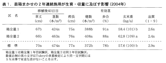 そこで,稲わらを全量鋤き込みとした条件で箱まかせ単独施用による4か年の連続栽培を行い,基肥と1回追肥による標準栽培との収量・品質等の変化について検討したので報告する。