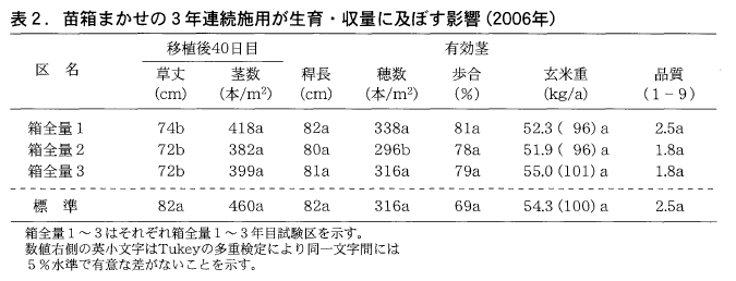 2006年の箱全量各区は共に標準区に対して移植後の生育はやや抑制され,40日調査の草丈は標準区の82cmに対して72~74cmと低くなった(表2)。また,茎数は標準区の460本/㎡に対し418~382本/㎡と少なかったが,有効茎歩合が標準区よりも10%程度高まった結果,穂数は標準区の316本/㎡に対して338~296本/㎡とほぼ遜色なかった。